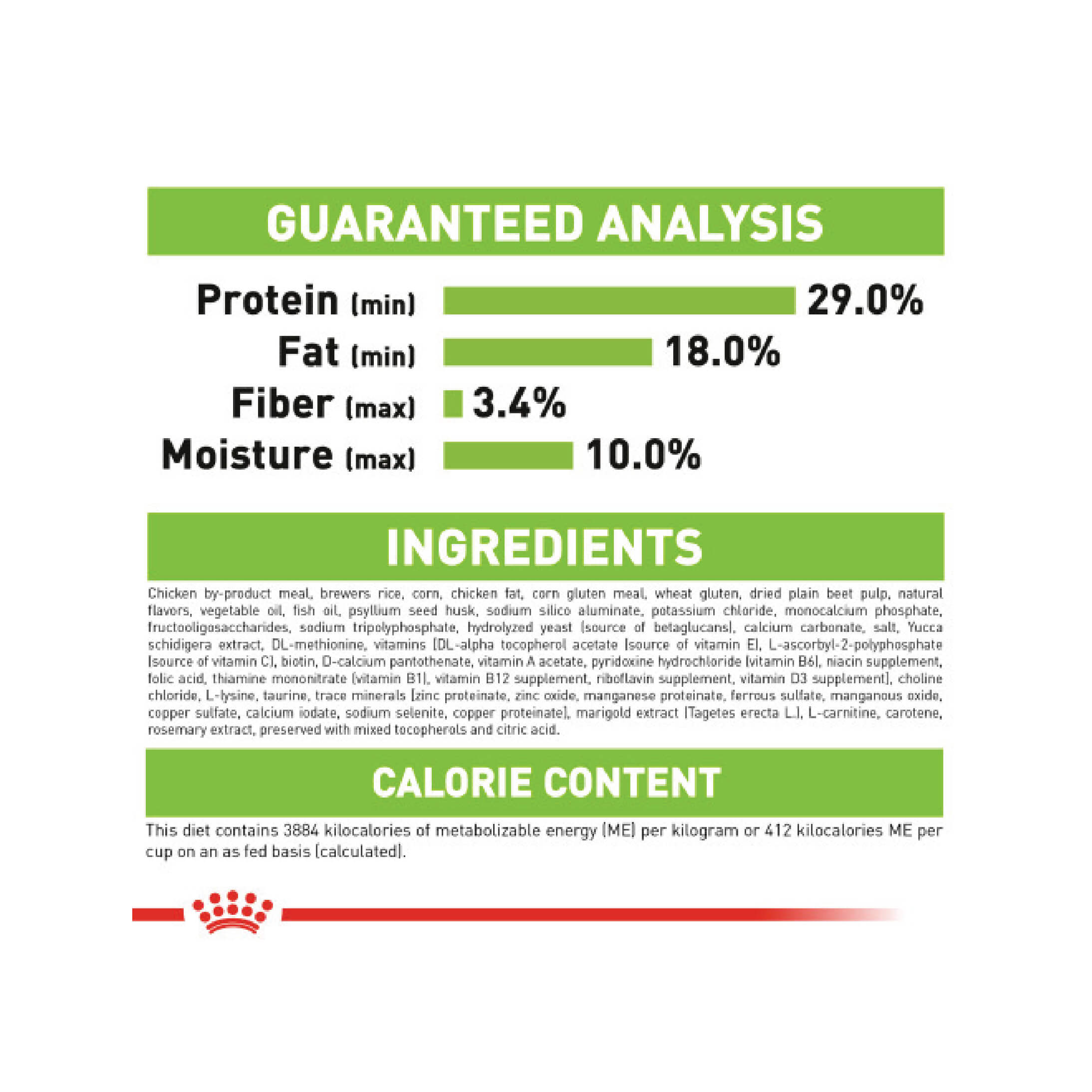 Chicken by-product meal, brewers rice, corn, chicken fat, corn gluten meal, wheat gluten, dried plain beet pulp, natural flavors, vegetable oil, fish oil, psyllium seed husk, sodium silico aluminate, potassium chloride, monocalcium phosphate, fructooligosaccharides, sodium tripolyphosphate, hydrolyzed yeast (source of betaglucans), calcium carbonate, salt, Yucca schidigera extract, DL-methionine, vitamins [DL-alpha tocopherol acetate (source of vitamin E), L-ascorbyl-2-polyphosphate (source of vitamin C), biotin, D-calcium pantothenate, vitamin A acetate, pyridoxine hydrochloride (vitamin B6), niacin supplement, folic acid, thiamine mononitrate (vitamin B1), vitamin B12 supplement, riboflavin supplement, vitamin D3 supplement], choline chloride, L-lysine, taurine, trace minerals [zinc proteinate, zinc oxide, manganese proteinate, ferrous sulfate, manganous oxide, copper sulfate, calcium iodate, sodium selenite, copper proteinate], marigold extract (Tagetes erecta L.), L-carnitine, carotene, rosemary extract, preserved with mixed tocopherols and citric acid.
